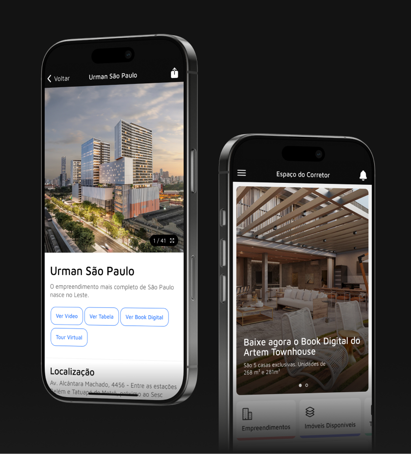 Desenvolvemos o aplicativo Espaço do Corretor com foco em mobilidade, agilidade e clareza de informação. Criado com Ionic, Angular 5 e JavaScript, o app funciona em iOS e Android e oferece acesso direto a fichas técnicas, disponibilidade de unidades, materiais de apoio, simulações e contato com clientes.