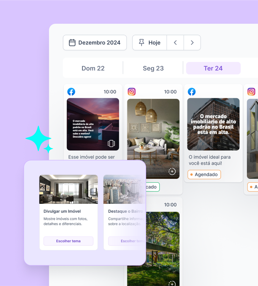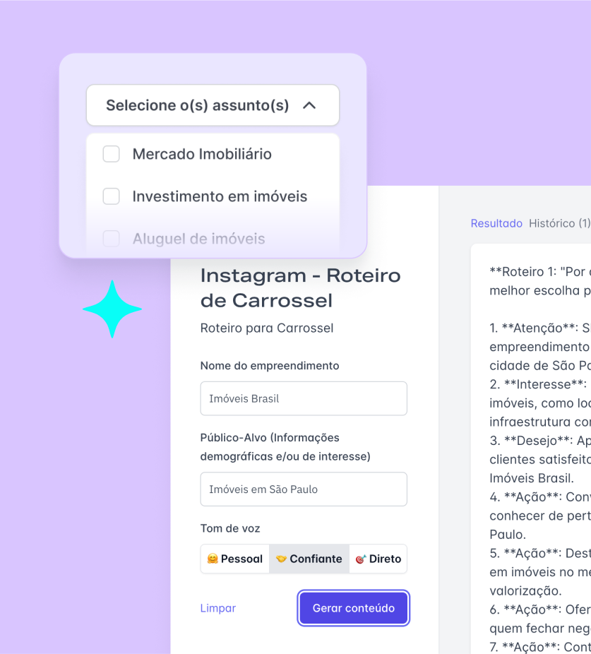 O principal desafio era criar uma plataforma intuitiva e eficiente que permitisse aos usuários gerar conteúdos personalizados para redes sociais, blogs, e-mails e anúncios imobiliários. Além disso, era fundamental que a solução oferecesse ferramentas para análise de performance e integração com sistemas já utilizados pelos profissionais do setor.