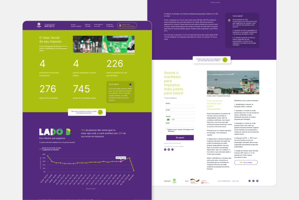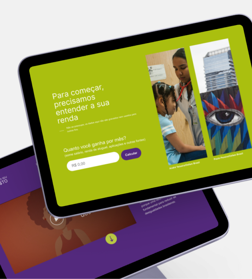 O principal desafio foi representar dados complexos de forma clara e envolvente, permitindo que os usuários compreendessem a injustiça do sistema tributário atual. Era essencial que a plataforma fosse responsiva, acessível e transmitisse as informações de maneira impactante.